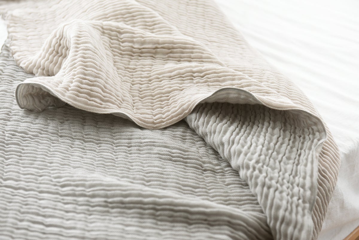 ヘリンボーン柄に織り上げたガーゼを、リバーシブル仕様にしています。