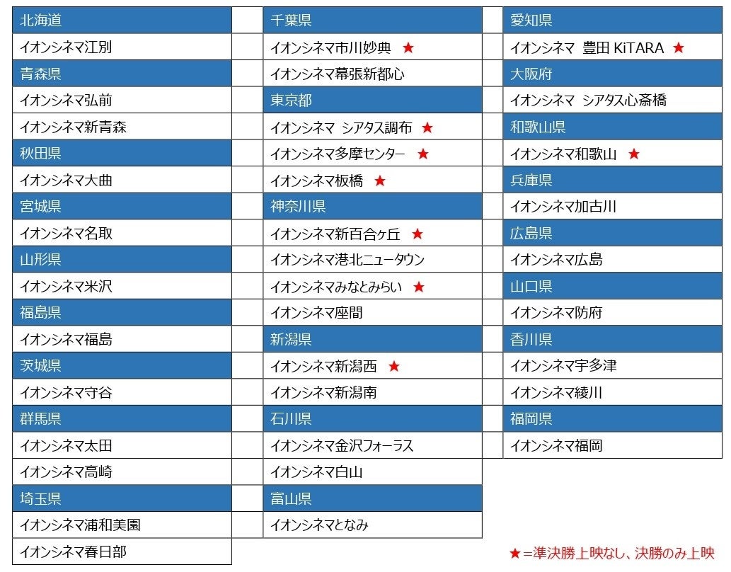 全国のイオンシネマ26劇場(準決勝)、35劇場(決勝) ※劇場一覧参照