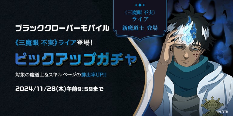 株式会社VIC GAME STUDIOS JAPAN(東京都新宿区、代表取締役:李 同校)は、テレビアニメ『ブラッククローバー』のアプリゲーム『ブラッククローバーモバイル 魔法帝への道 The Opening of Fate』(以下、ブラクロモ)において、本日11月14日(木)よりSSR魔道士「《三魔眼 不実》ライア」と魔道士スキルページ「復讐の盟約」がピックアップガチャに新登場したことをお知らせいたします。