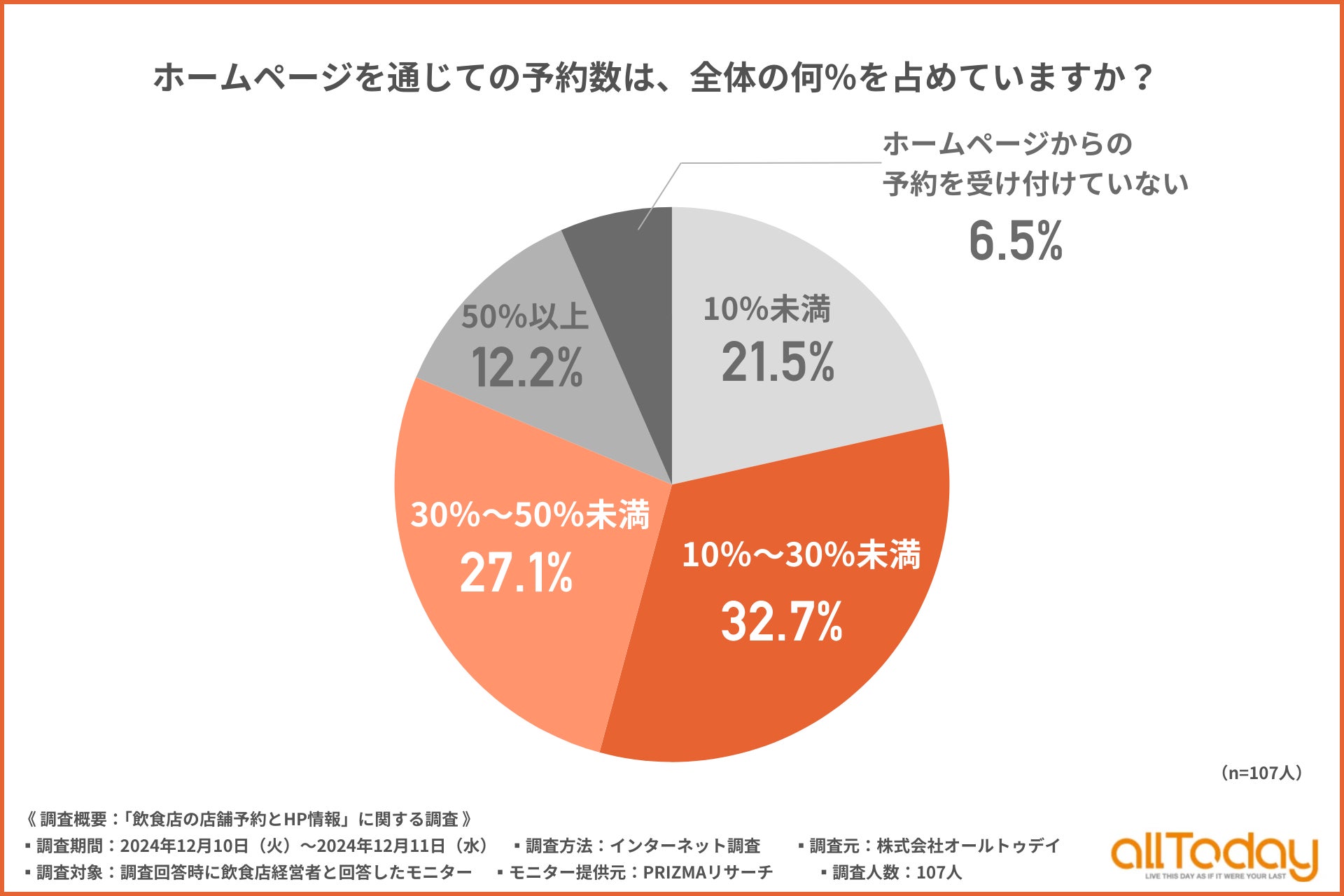 続いて、「ホームページを通じての予約数は、全体の何%を占めていますか?」と質問したところ、『10%~30%未満(32.7%)』と回答した方が最も多く、『30%~50%未満(27.1%)』『10%未満(21.5%)』『50%以上(12.2%)』『ホームページからの予約を受け付けていない(6.5%)』と続きました。