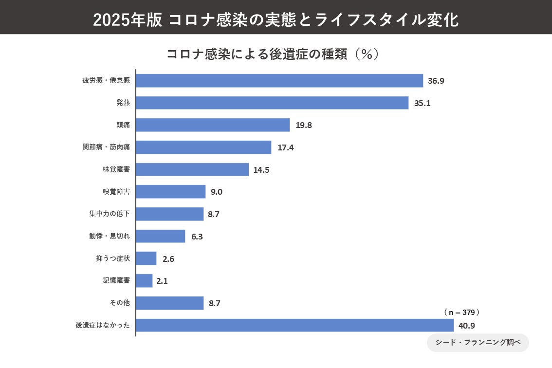 コロナに感染した379 人を対象に後遺症の種類を複数回答で調べたところ「後遺症はなかった」とする割合は40%となりました。