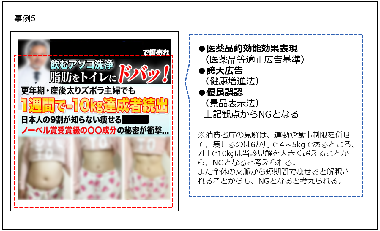 例:必ず痩せることができる、脂肪便を排出させる、代謝を上げてくれる、脂肪を燃焼させる、痩せ体質になれる、2週間で13.1kgの減量、BA画像との組み合わせで過度に痩せるような表現