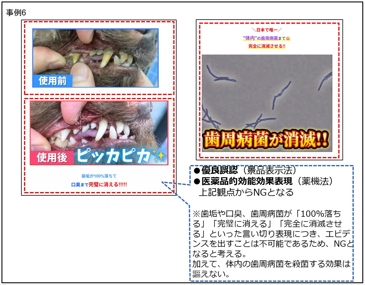例8:歯みがき類において、ブラッシング効果である旨の記載なしに歯を白くするかのような表現(マウスウォッシュ商材)。また、物理的効果ではなく成分にて抗菌作用があるかのような表現。その他、歯が揺れるほどに弱っていた歯茎が固いものを噛めるほどに強くなったという、効果として誇大な表現。