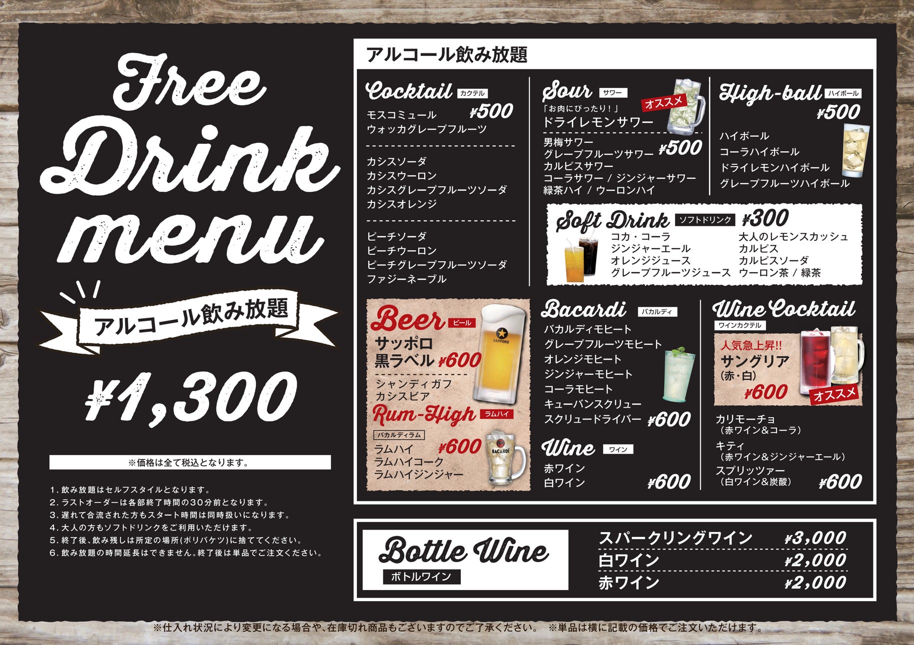 +1300円(税込)でアルコール飲み放題(平日4時間!、土日祝3時間!)も追加可能。