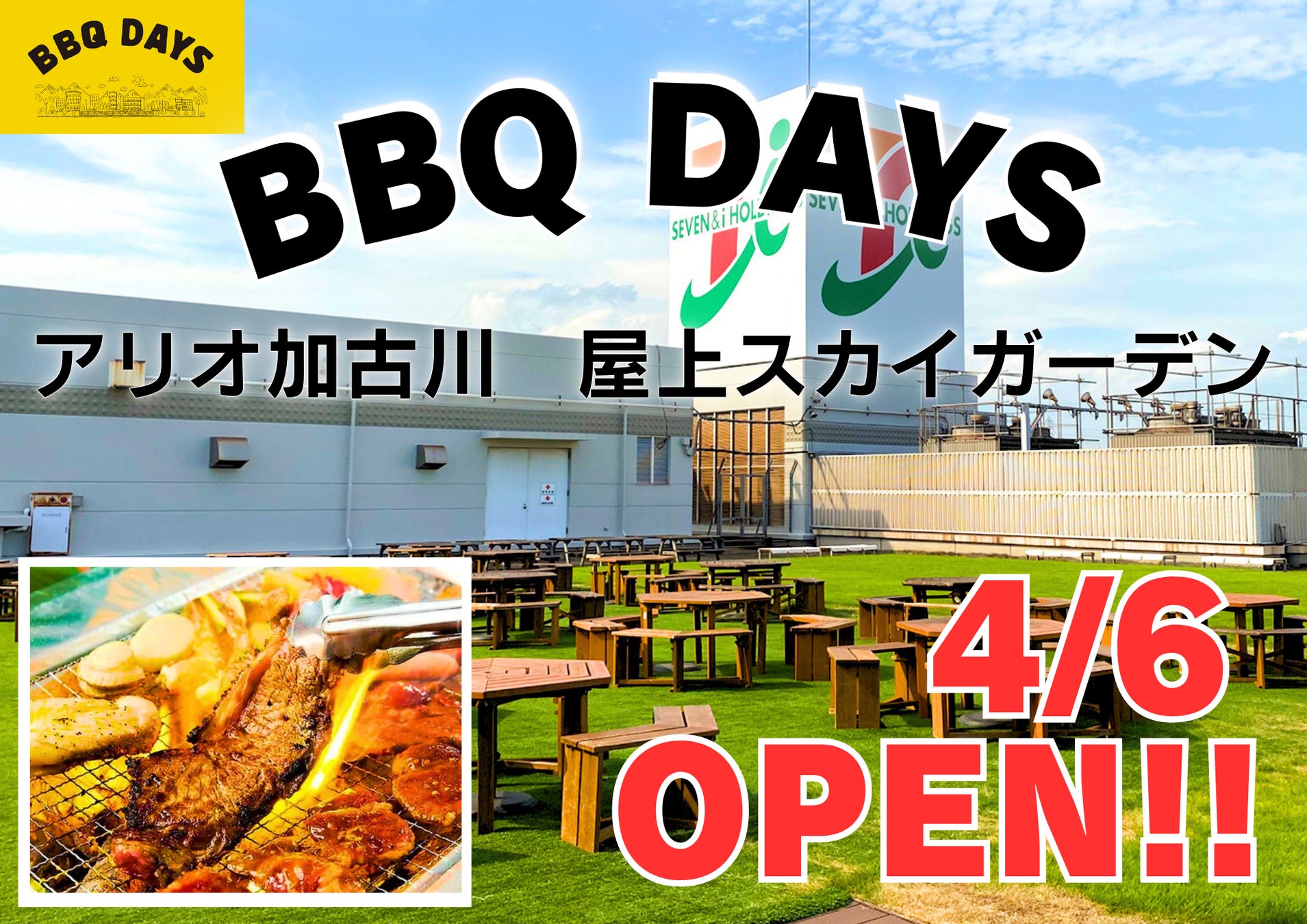 兵庫県【アリオ加古川】屋上バーベキュー会場「BBQDAYS」 がグランドオープン!! 期間限定(4/6~10/14)★★★《 全員ソフトドリンク飲み放題付き‼ 》 手ブラもOK!!
