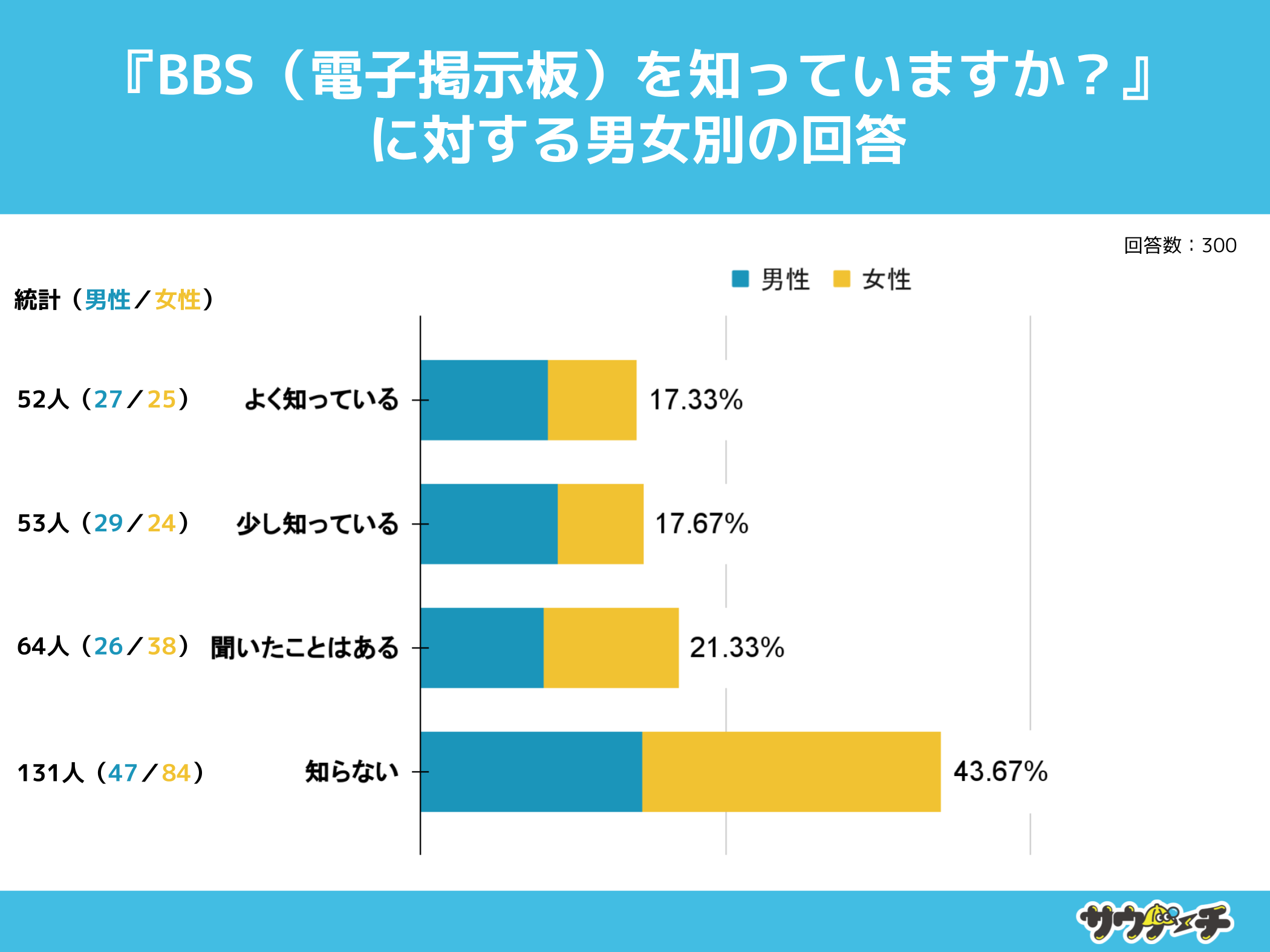 10〜30代男女を対象とした『BBS(電子掲示板)を知っていますか?』というアンケートで、最も多かった回答は「知らない」で約44%でした。