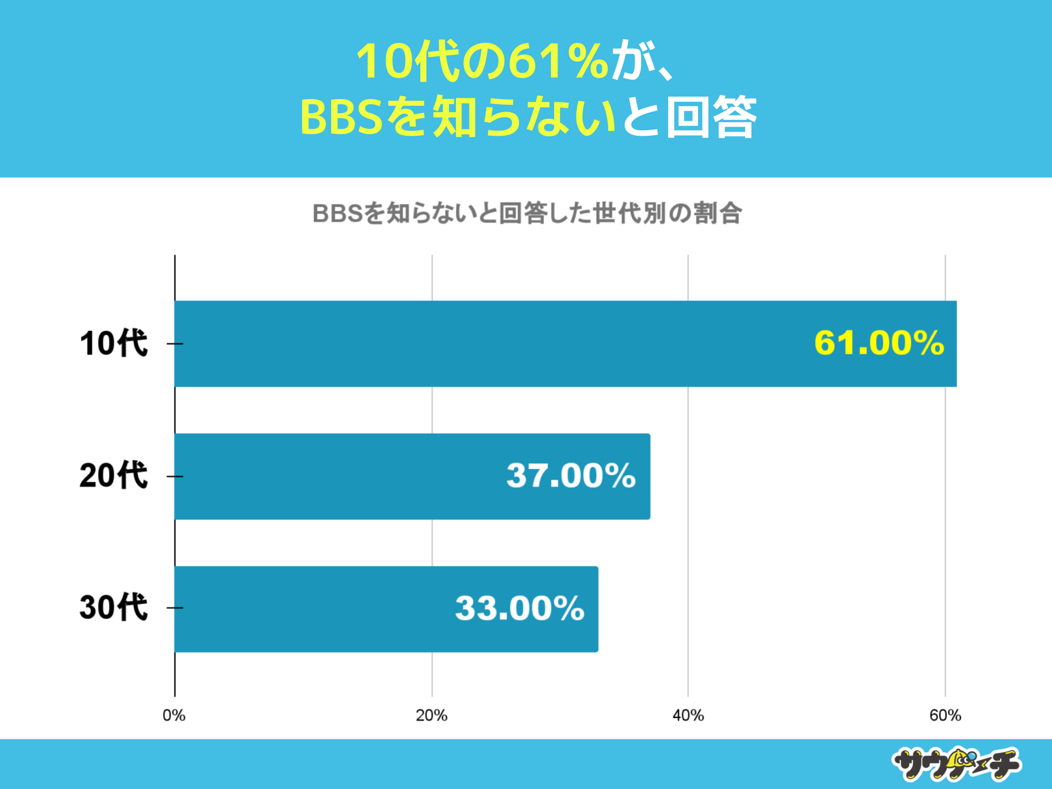 また、BBSを知らないと回答した割合を世代別でみてみますと、10代の61%が最も高く、次いで20代の37%、30代が33%で、30代と比べて10代は約1.8倍高い結果となりました。