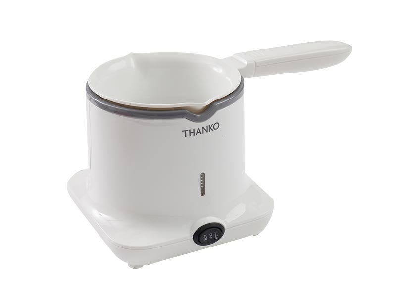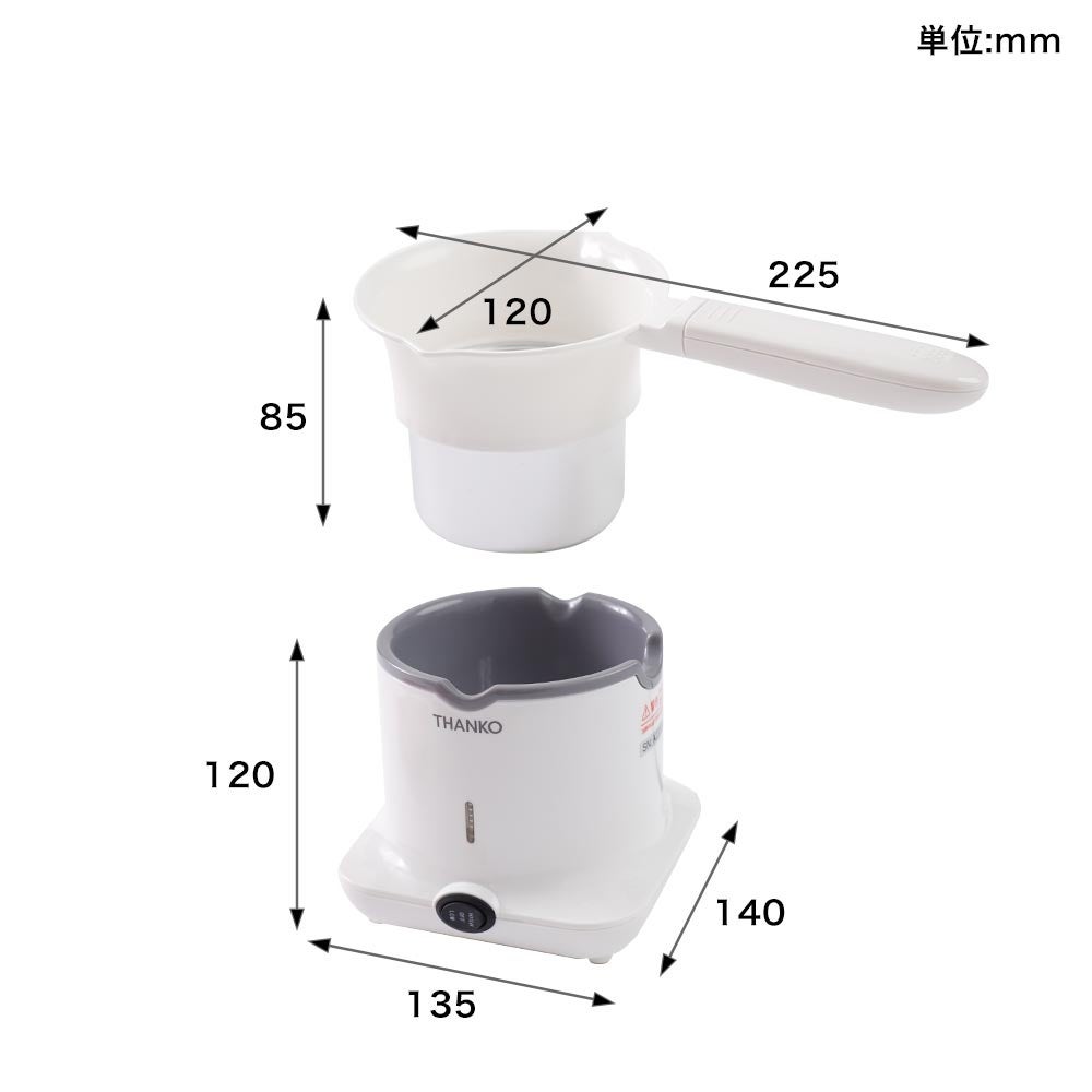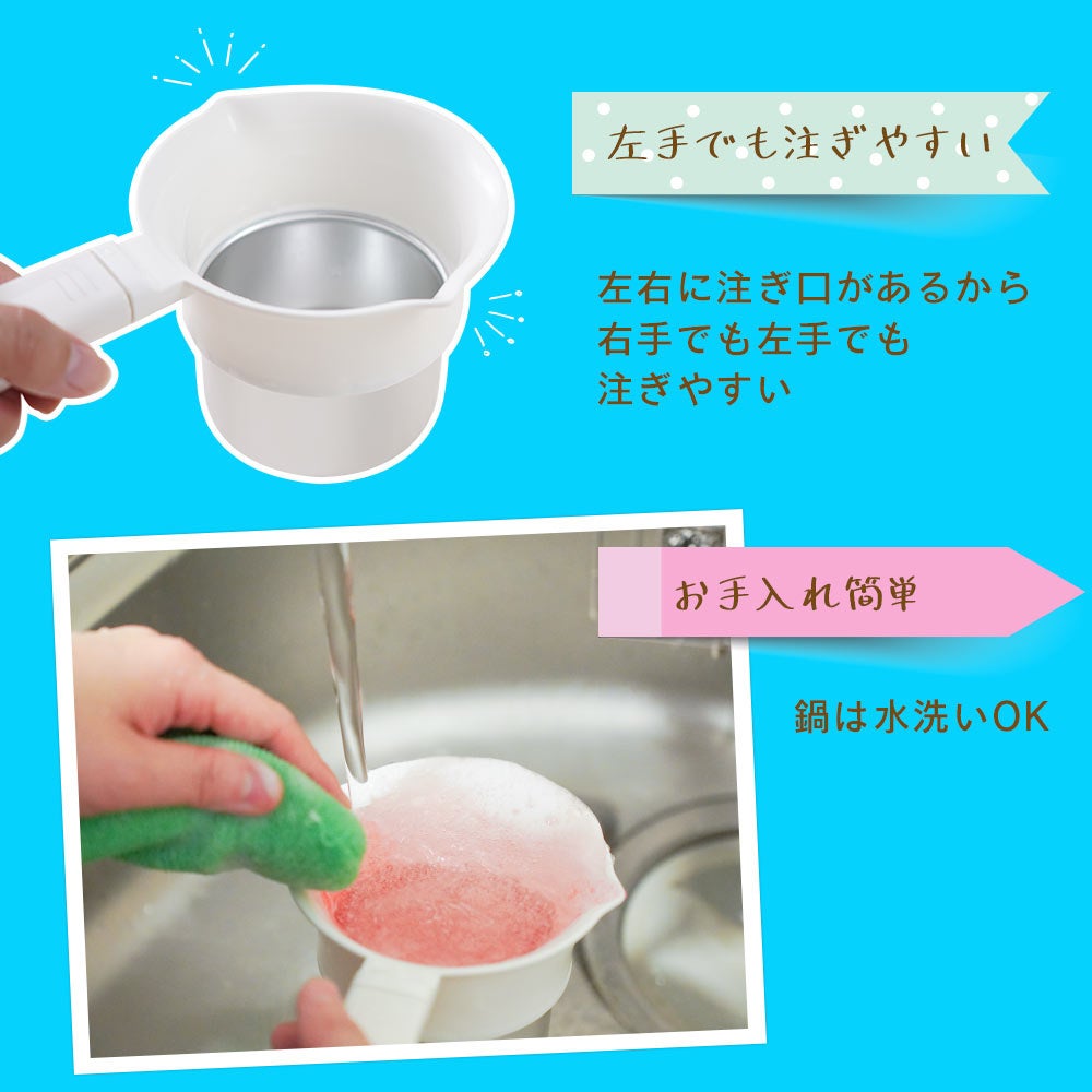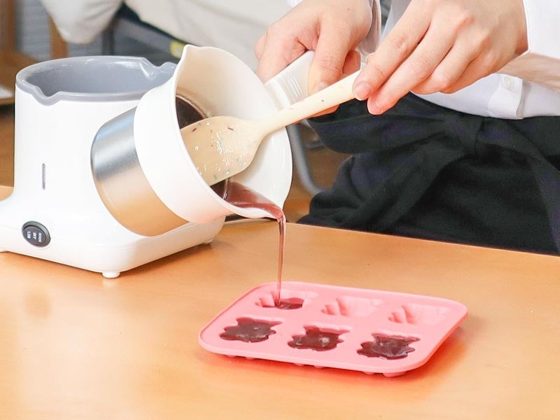 鍋にチョコレートを入れて、電源をHIGHに入れればチョコレートを溶かすことができ、付属の型に流し込んで冷やしてハートやクマの形のチョコレートを作れます。鍋は左右どちらでも注ぎ口がある両口タイプで右手でも左手でも注ぎやすい形状。鍋は丸洗い可能でお手入れ簡単です。