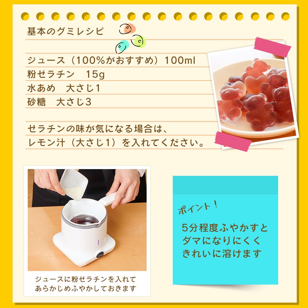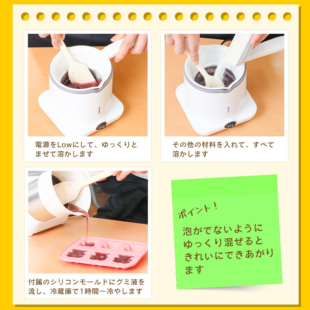 付属の専用鍋にお好みのジュースとゼラチンを入れ、本体の電源をLOWに入れて混ぜる。その後、付属の型(モールド)に流し込んで冷蔵庫で1時間ほど冷やすだけで自家製グミが完成。お好きな材料でグミを作ることができます。クマの形とハートの形の2種類の型が付属。付属の型以外にも市販のシリコン型(モールド)で様々な形のグミを作ることも可能です。