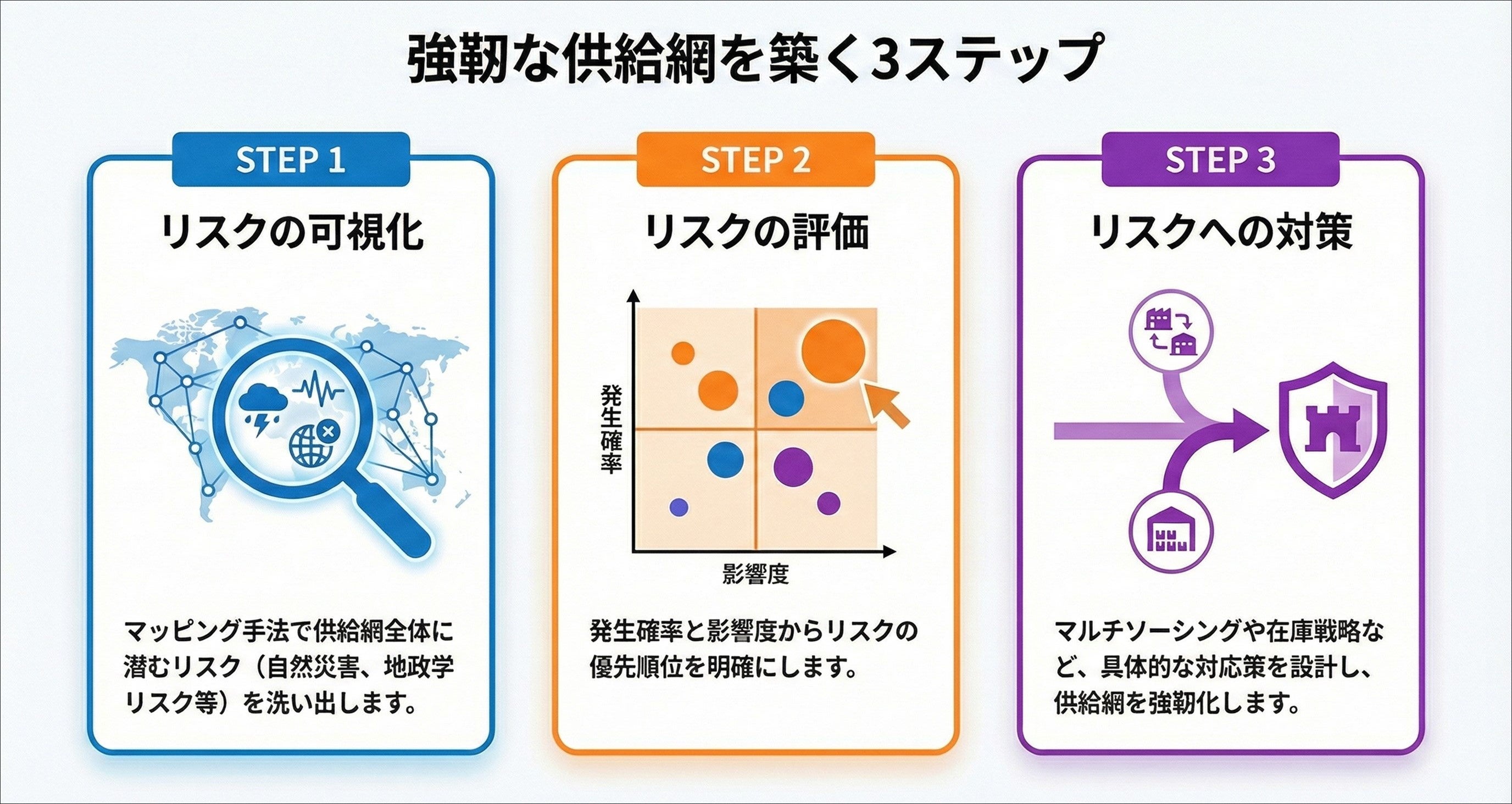 こうしたリスクによる供給網の断絶は企業価値に甚大な影響を及ぼすため、リスクを正確に特定・評価し、実効性のある対策を講じることが企業の重要課題となっています。