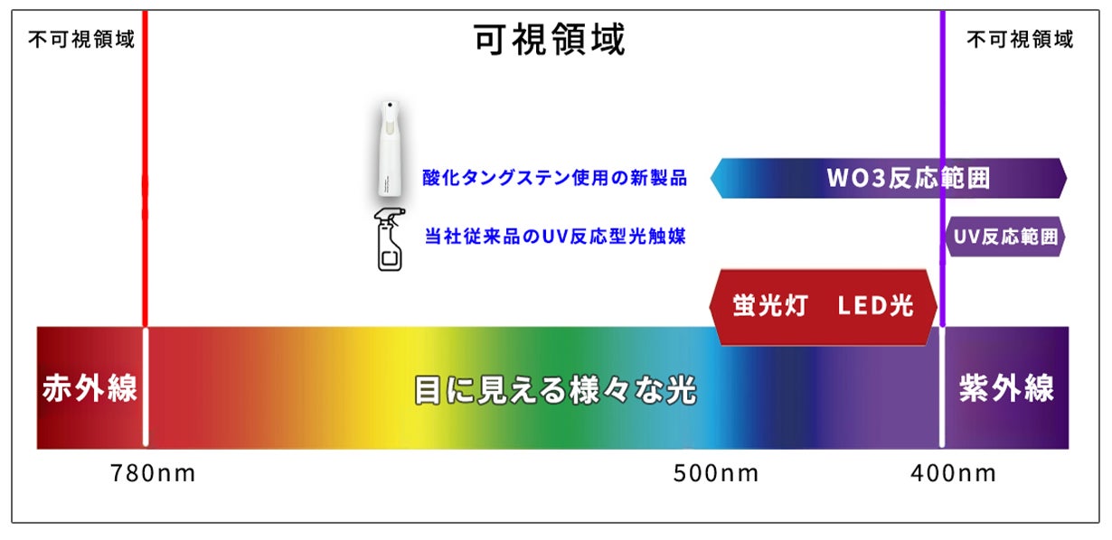 このほど、太陽光だけでなく、光量が微量の蛍光灯や電球の光でもしっかり反応する光触媒消臭剤を開発致しました。