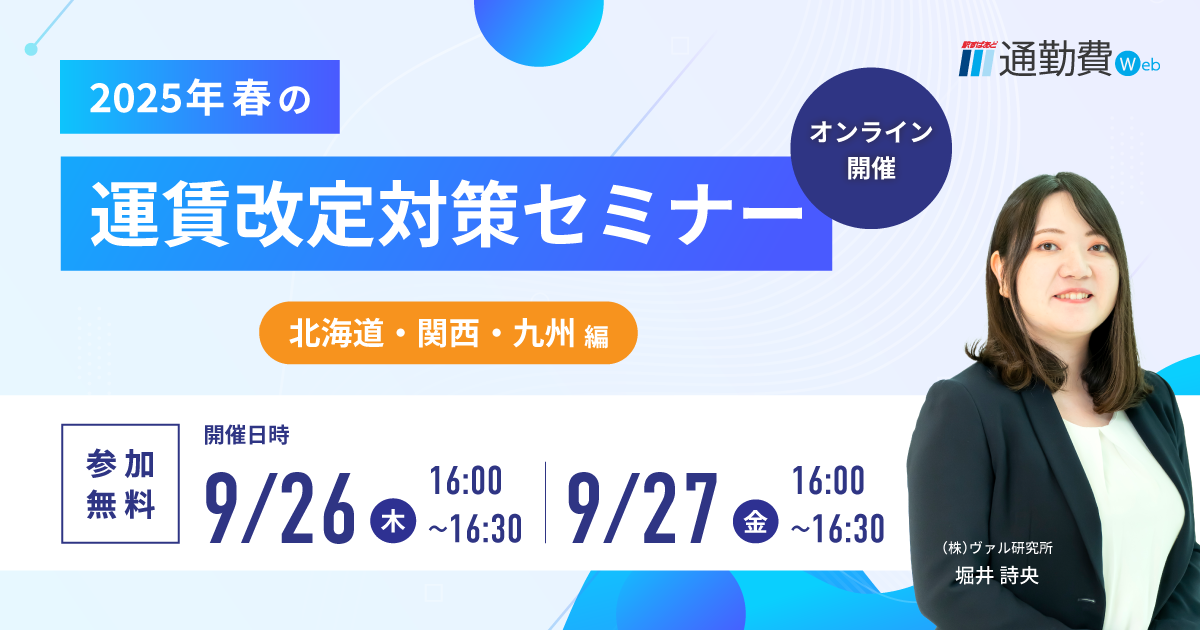 【9/26(木)、27(金)開催】通勤費管理の担当者必見!\ 2025年春の運賃改定対策セミナー/北海道・関西・九州編
