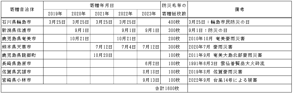 寄贈品:防災毛布(災害支援用リサイクル毛布)100枚/マスク計5,000枚