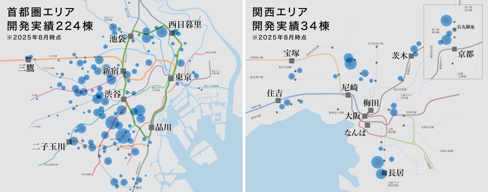当社は、総合不動産流通企業として自社開発の一棟投資用不動産「WELL SQUARE(ウェルスクエア)」を展開しています。ウエルスクエアシリーズは2014年に開発・販売を開始して以来、関東エリアでは優良な用地情報を取得できる東急沿線を中心に首都圏全域で224棟、関西エリアでは大阪・神戸・京都など主要都市を厳選し34棟、合計で250棟超の開発実績があります。(2025年8月時点)