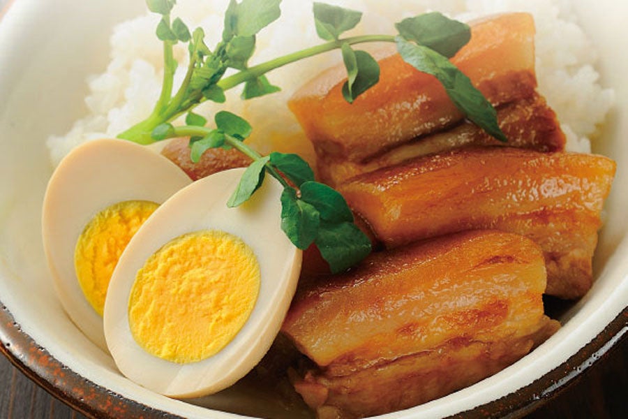 ジューシーな豚の角煮と煮卵は相性抜群!ごはんが進む丼メニューです。黄味の黄色が彩りを添えます。