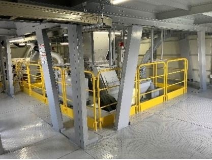 2. 粉体用の貯蔵ビン3つ、混和剤用のタンク3つを配備するとともに、その他の材料をミキサに投入しやすくするため、材料投入フロアに、一般的なコンクリート製造プラントには無い材料保管場所を確保