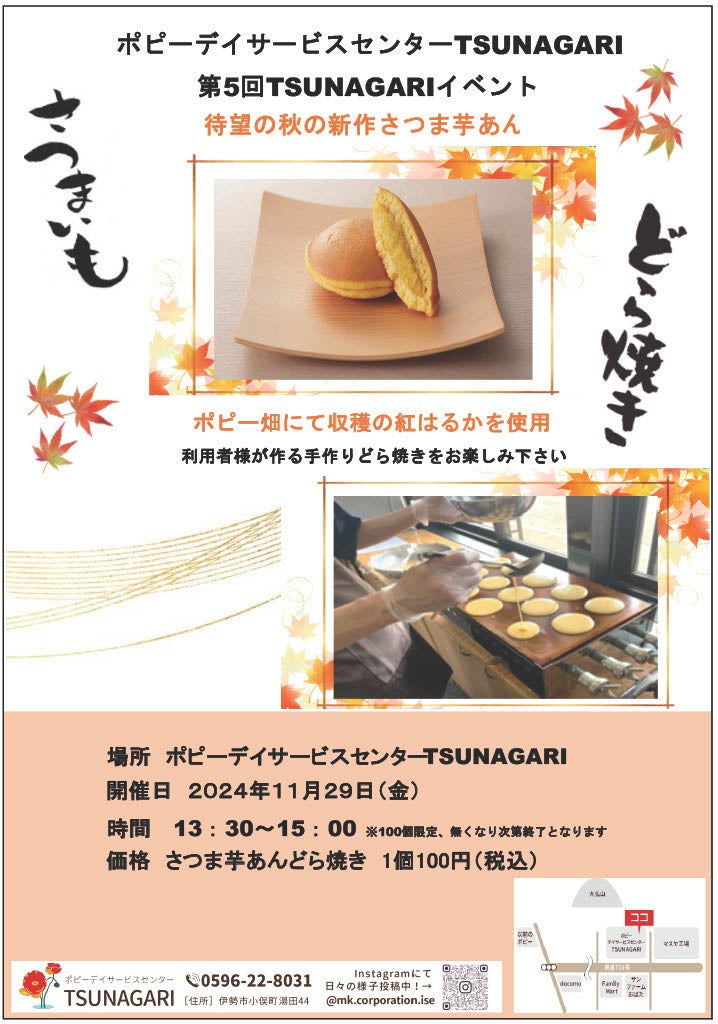 IXホールディングス株式会社(本社:三重県伊勢市)のグループ会社、株式会社エムケイ・コーポレーション(本社:三重県伊勢市、代表取締役社長:平林 勇二)は、2024年11月29日(金)、運営する「ポピーデイサービスセンター TSUNAGARI」にて利用者様が手作りした「さつまいもあんのどら焼き」を100個限定で販売いたします。