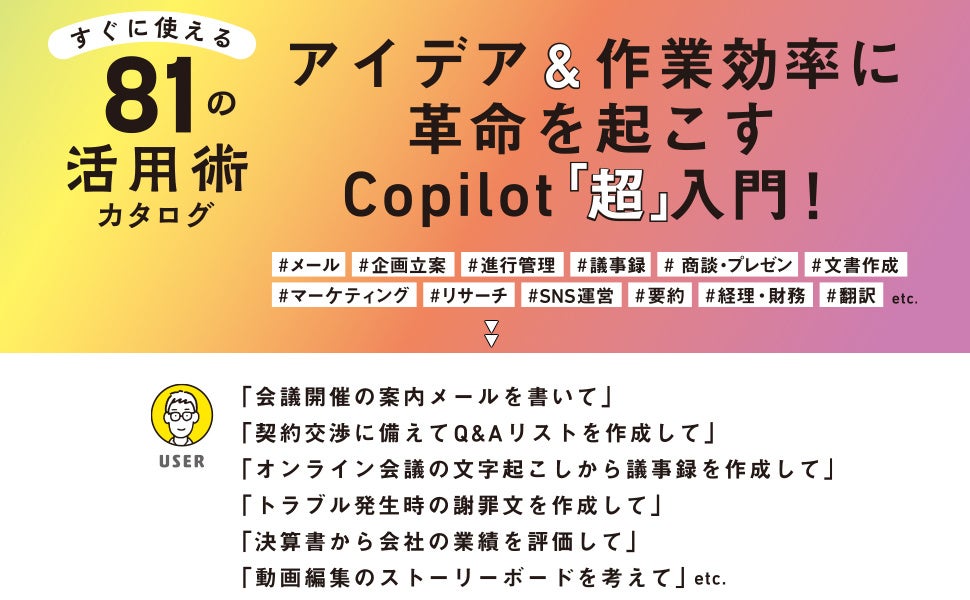 本書は、Microsoft Copilotを実務で使いこなすための実践書として、総務・営業・経理・企画・開発など、職種別の具体的な活用術を解説しています。