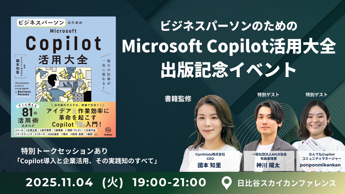 Cynthialy株式会社(本社:東京都渋谷区、代表取締役:國本知里)は、代表の國本が監修を務める書籍「ビジネスパーソンのためのMicrosoft Copilot活用大全 毎日の仕事が一気に変わる!」が、2025年10月30日(木)に株式会社Gakkenから発売されることをお知らせいたします。