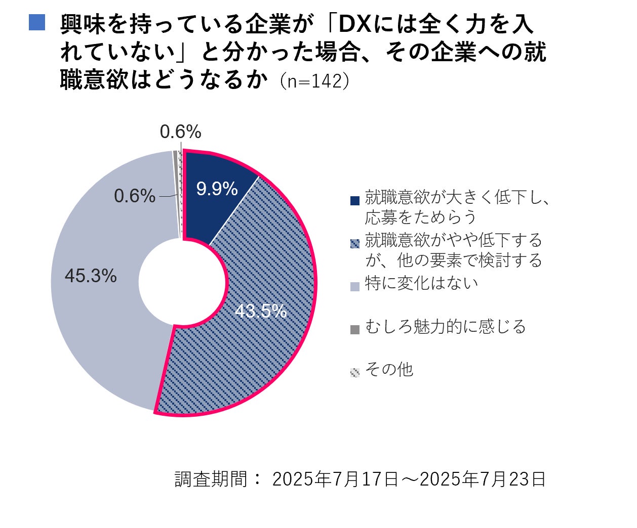 さらに、興味を持っている企業が「DXには全く力を入れていない」と分かった場合、その企業への就職意欲はどのように変化するかを問う設問では、最も多かった結果は「就職意欲がやや低下するが、他の要素で検討する」が43.5%、 「就職意欲が大きく低下し、応募をためらう」を選択した学生は9.9%と半数以上の学生の就職意欲が低下するという結果となりました。