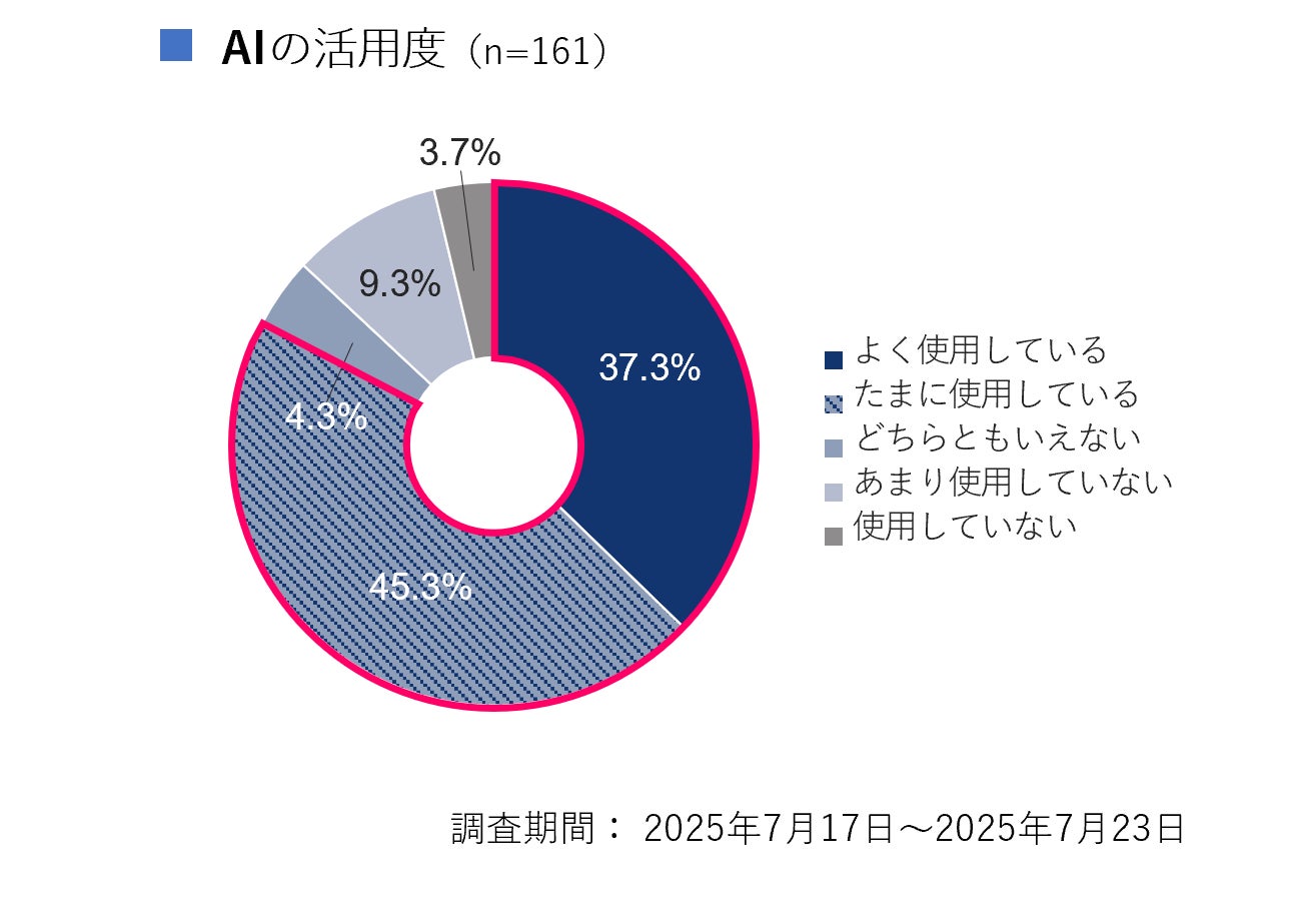 AIの活用度に関する調査では、AIを「よく使用している」と回答した学生が37.3%、「たまに使用している」は45.3%で、8割を超える学生がAIを日常的に利用していることがわかりました。