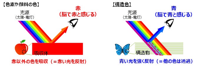 背景色によっても色合いが変化。黒色の背景に構造色を加飾すると、透過光が吸収されて構造色の反射色が見えるが、白色の背景では透過光が吸収されず、その補色が見えるようになる。