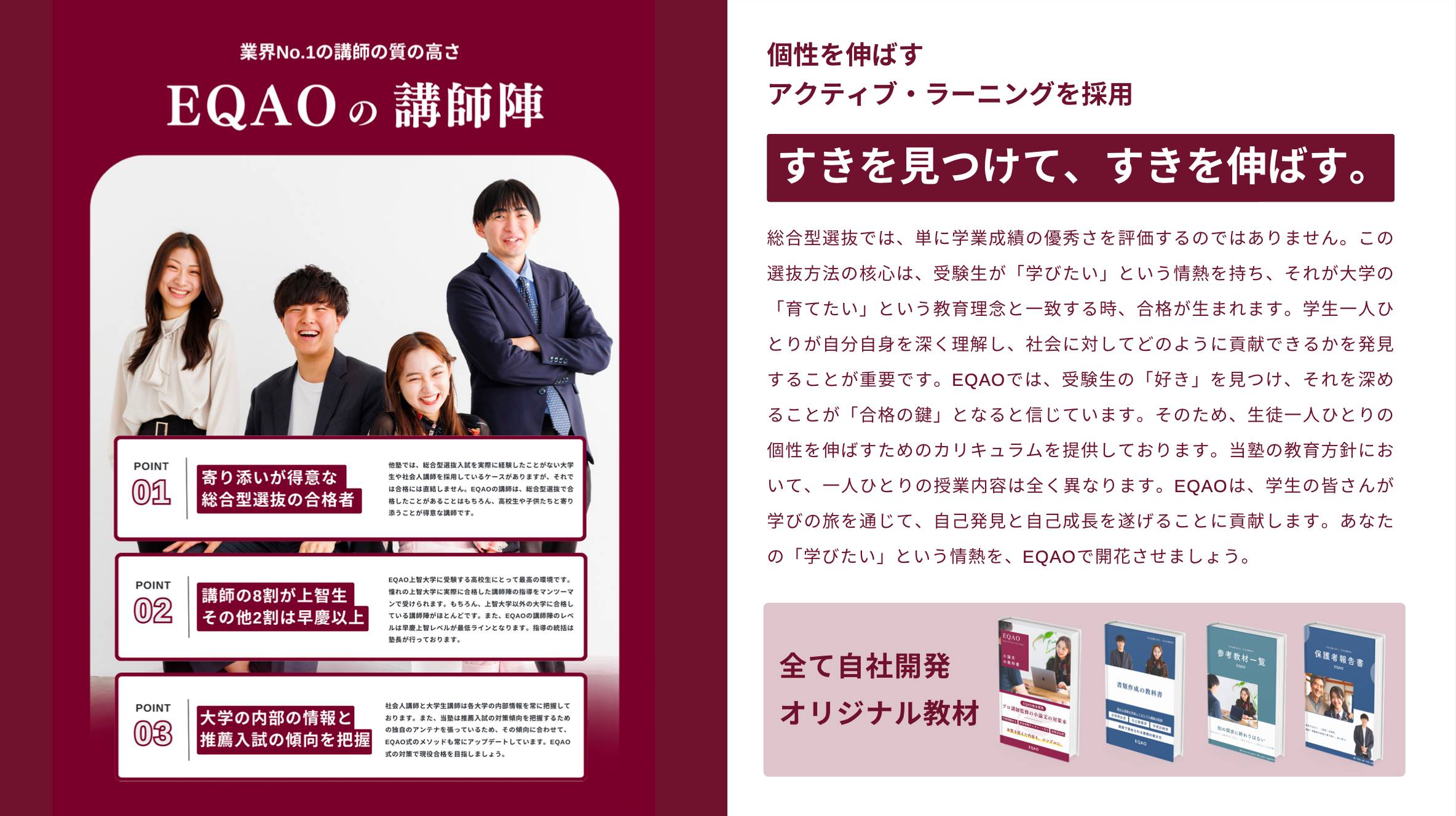 〈武蔵大学専門塾 総合型選抜対策〉推薦入試専門塾EQAO業界トップクラスの合格率!総合型選抜入試で武蔵大学に合格したいなら武蔵大学専門塾EQAO。武蔵大学合格を支援する相談窓口を設置します。2/15〜