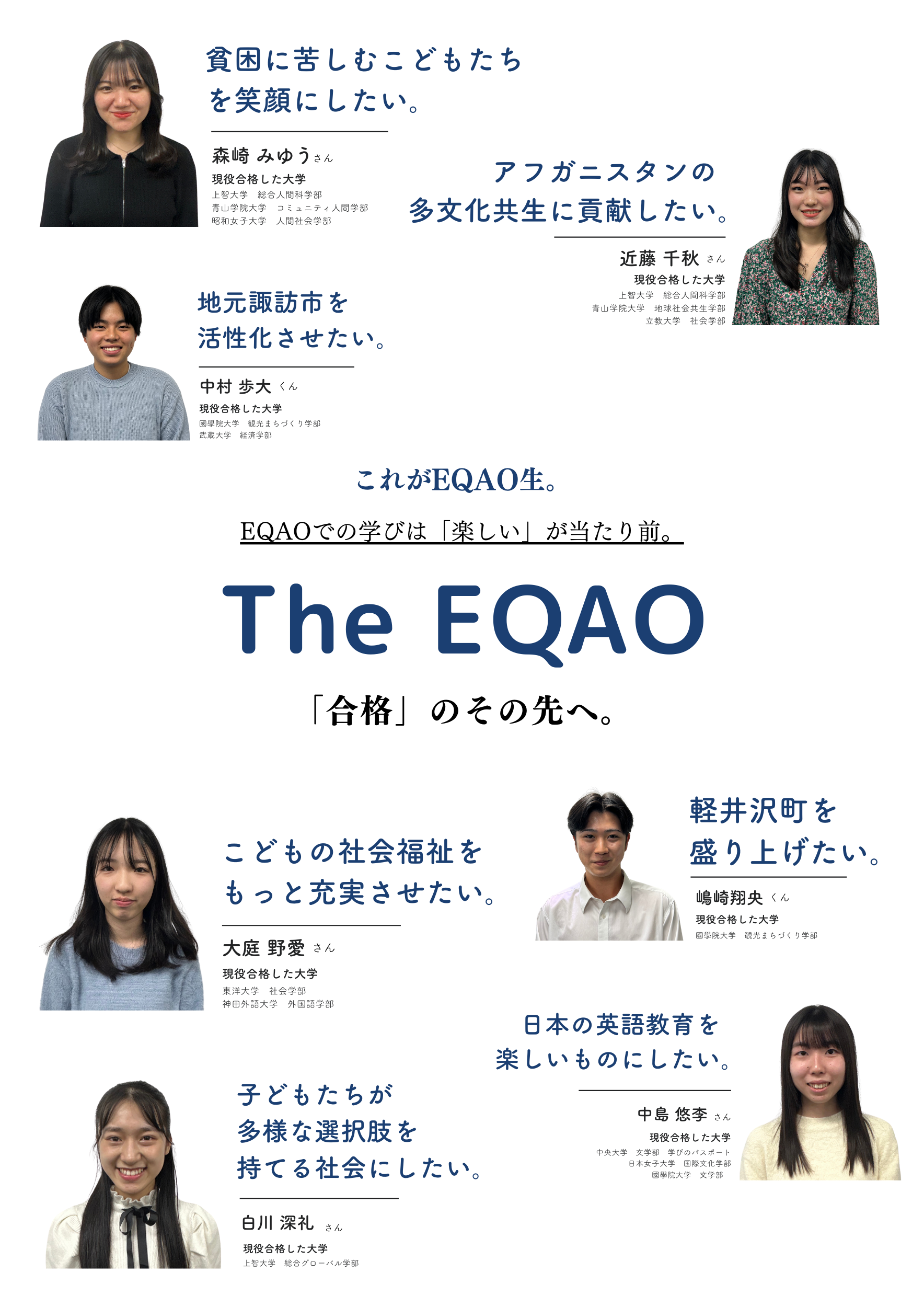 中•高校時代、バスケットボール部に所属。高校1年の時には、カナダに1年留学し、帰国後は、数々の実地調査を経て、移民の受け入れ体制について英語で論文を執筆。英語資格は、IELTS6.5、英検準1級を取得。成績は評定平均4.6を維持。その他にも、英語プレゼン大会近畿優勝、複数の政治家への取材、ボランティア委員会委員長としての活動など、多岐に渡る活動を武器にAO入試を利用して受験に挑むも、見事に惨敗。5校から不合格をいただいた。AO入試において強いとされる実績を数多く持ちながらも、不合格だったことを疑問視し、AO入試について研究を開始。そこで発見した「必敗法」を踏まえて、書類を全て書き直し出願したところ、上智大学をはじめとする難関私大3校に合格。この経験から、18歳の時にEQAOの前身であるAO入試専門塾ONLINE AOを緊急事態宣言中に起業。19歳の時には、リラクゼーション事業を立ち上げ、2023年に事業譲渡。20歳の時には、浜松町にEQAO本校舎/オンライン校を設立。「すきを見つけて、すきを伸ばす」という教育理念を胸に、挑戦を恐れず、未来ある子ども達の成長に人生を捧げたい。