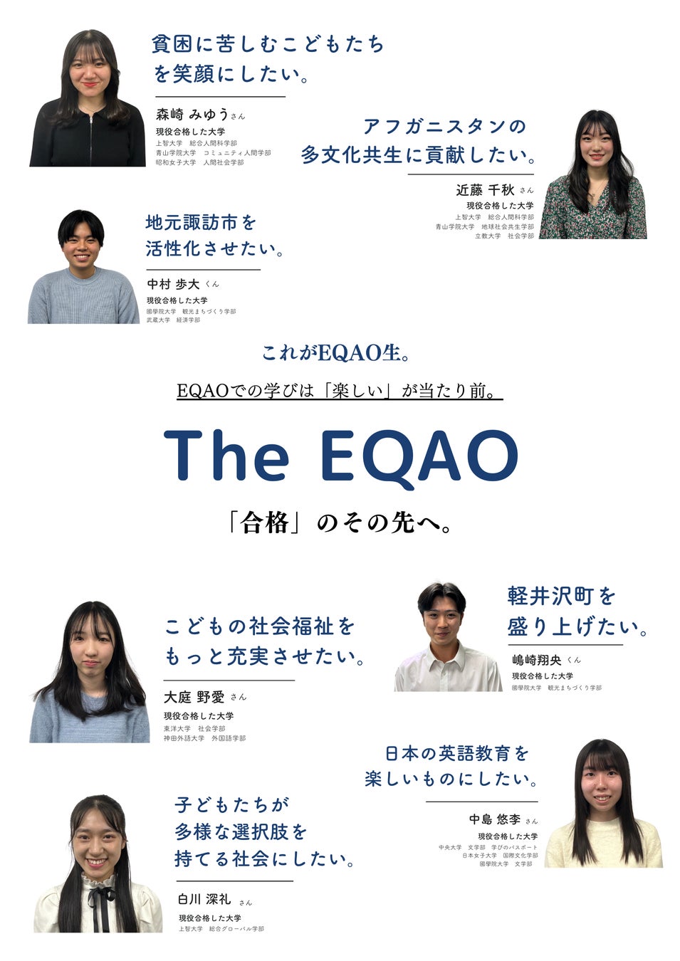 上智大学文学部新聞学科2021年入学。高校時代、音楽やアイドル、お笑いなどの趣味に没頭する『オタク気質』を活かし、個人で漫才のメディア史に関する探究活動を始める。大学受験では、"好き"は"学び"に繋がるという気づきから、総合型選抜入試で難関私大に3校合格。『すきを見つけて、すきを伸ばす。』学びの根源は自分の心に秘めた『すき』という気持ちにあると確信し、大学入学後、総合型選抜入試対策塾の運営を始める。大学3年時にはEQAO浜松町校校舎長を務める。生徒の本音に寄り添い、彼らがもつ視点に常に共感する姿勢を大切にした指導を行う。日本の子どもたちが『すき』と真剣に向き合える教育環境の提供に今後も尽力する。