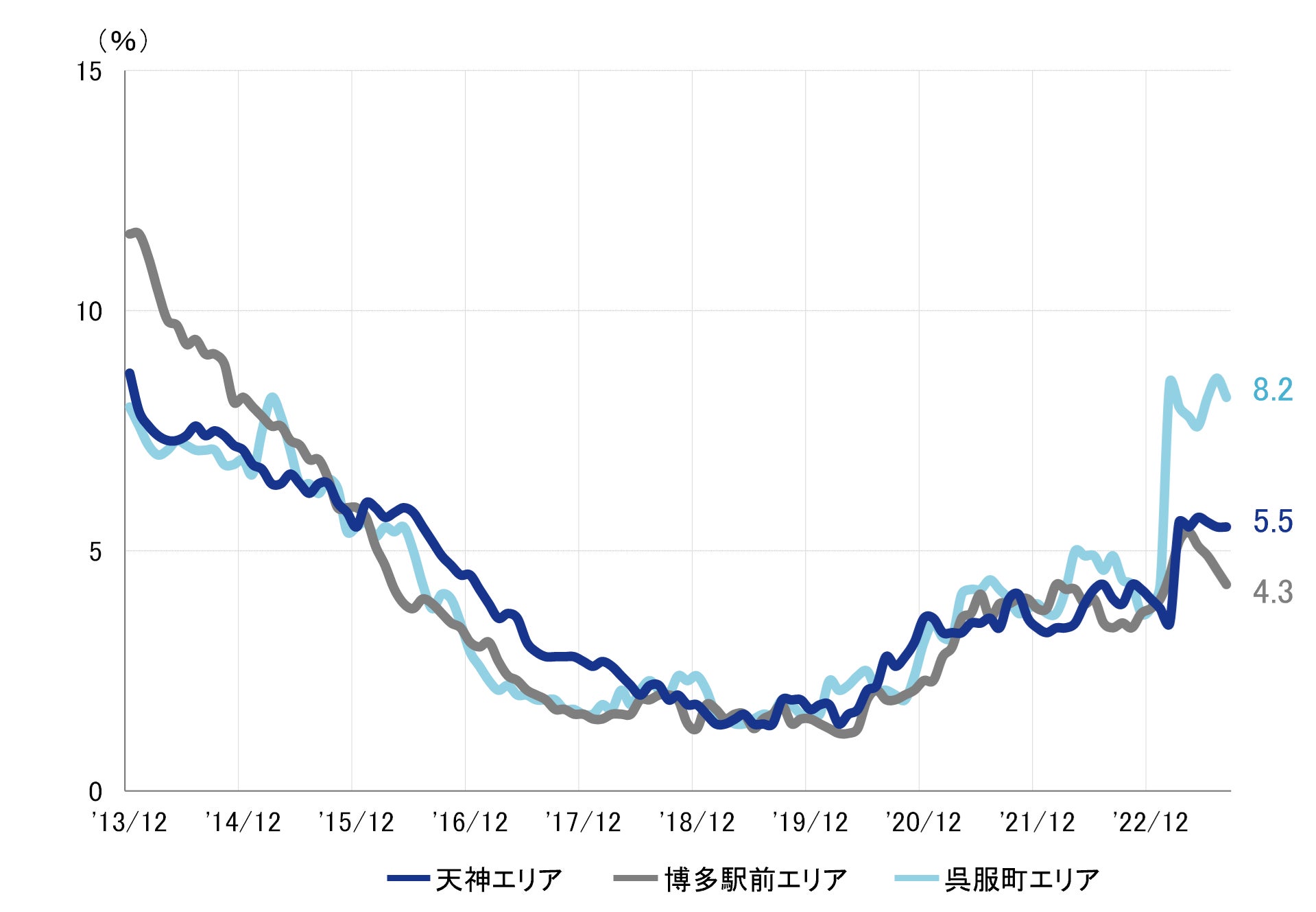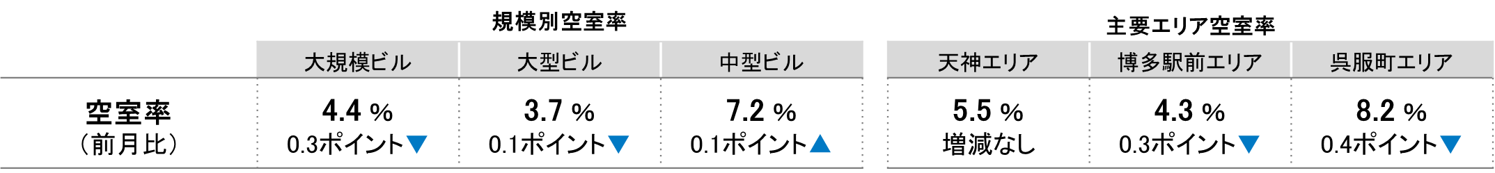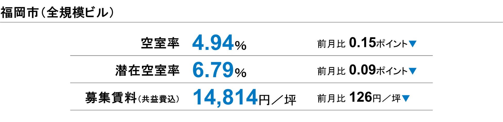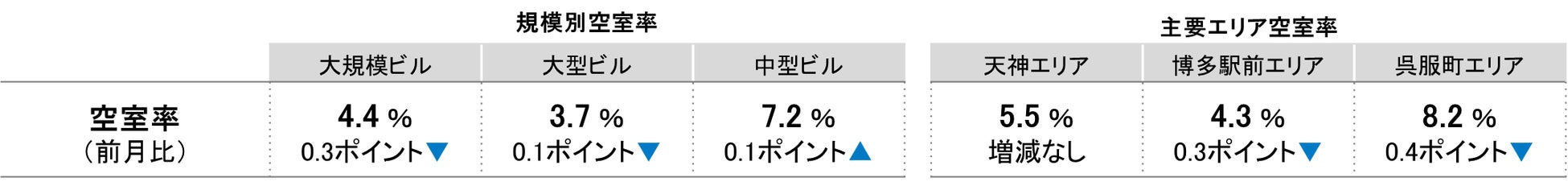 全規模ビル 主要エリア 空室率:「博多駅前」4ヵ月連続で低下し、4%台前半へ