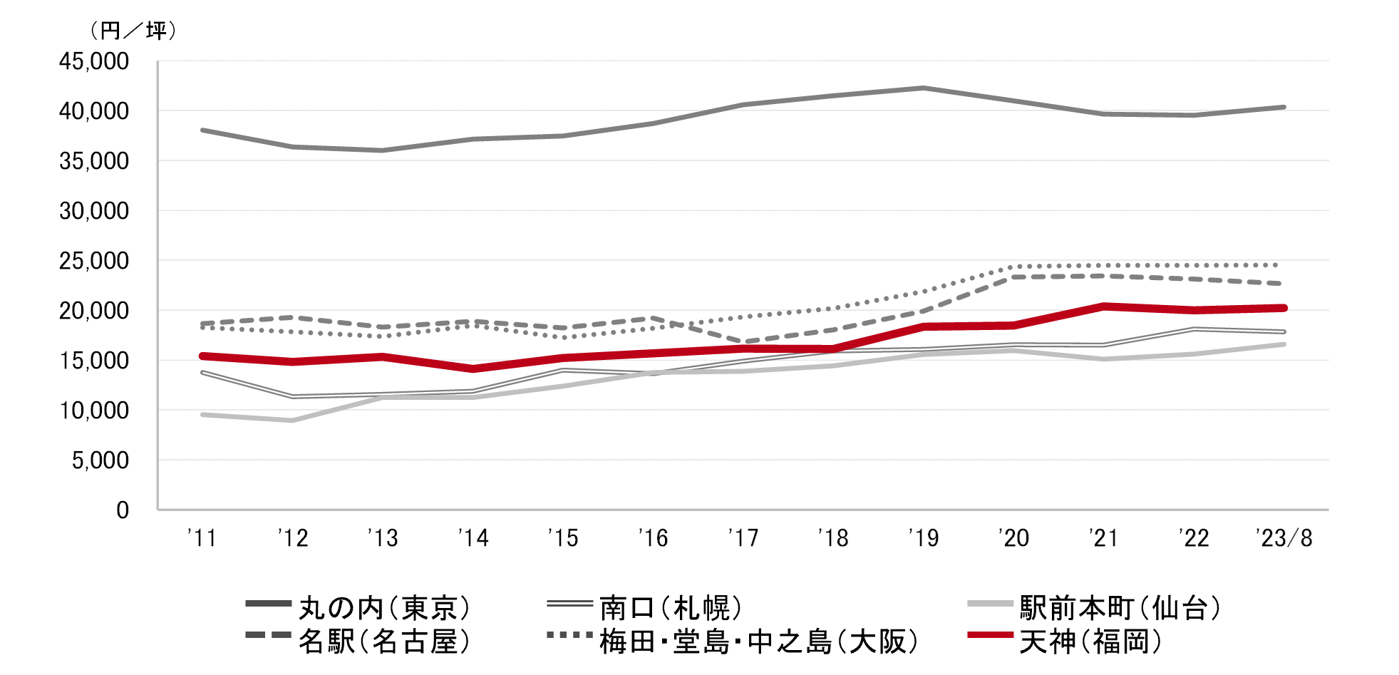 <募集賃料の推移(6大都市 大規模ビル・主要駅前地区)>