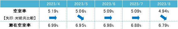 空室率は前月比マイナス0.15ポイントの4.94%となり、6ヵ月ぶりで4%台に低下した。今年竣工した複数の新築大規模ビルでの成約が、主な低下要因となっている。潜在空室率は前月比マイナス0.09ポイントの6.79%だった。高価格帯のビルではテナント誘致に時間を要するケースも見られるが、オフィス需要は活発な状況が継続しており、新築や築浅ビルへの引き合いも増加傾向にある。