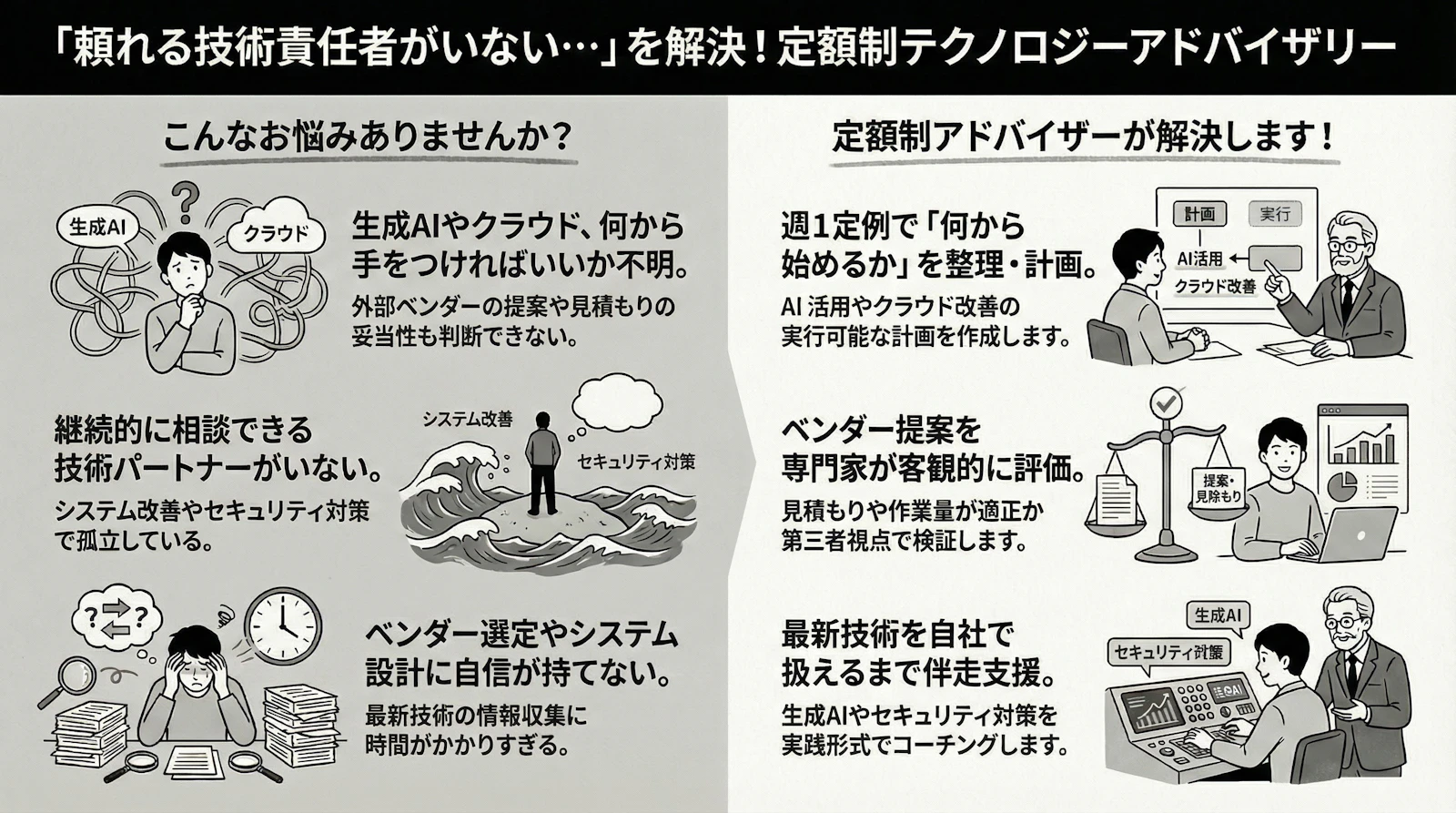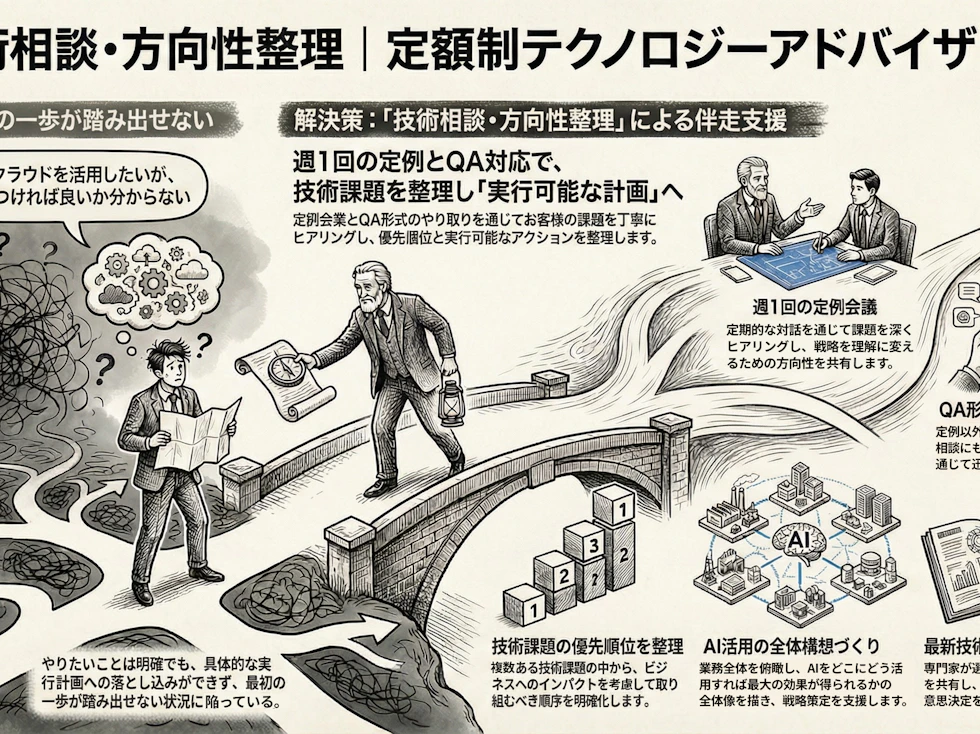 生成AIやクラウド活用を推進したい意欲はあるものの、何から着手すべきか分からず、外部ベンダーの提案内容や見積もりの妥当性を判断できる専門知識が社内にないDX推進室。AWS・GCPなどシステム基盤の改善やセキュリティ対策を進めたいが、自社に詳しい人がいない領域が多く、継続的に相談できる技術パートナーが不在で孤立している情報システム部。AI駆動開発や最新技術を取り入れたいが、情報収集に時間がかかり、システム設計やベンダー選定の意思決定に自信が持てないプロジェクトマネージャー——このような悩みを抱える企業は少なくありません。