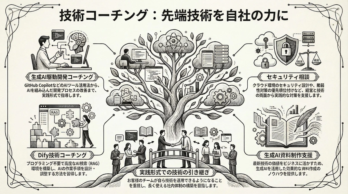生成AI駆動開発コーチング Dify技術コーチング セキュリティ相談 生成AI資料制作支援 実践形式での技術の引き継ぎ
