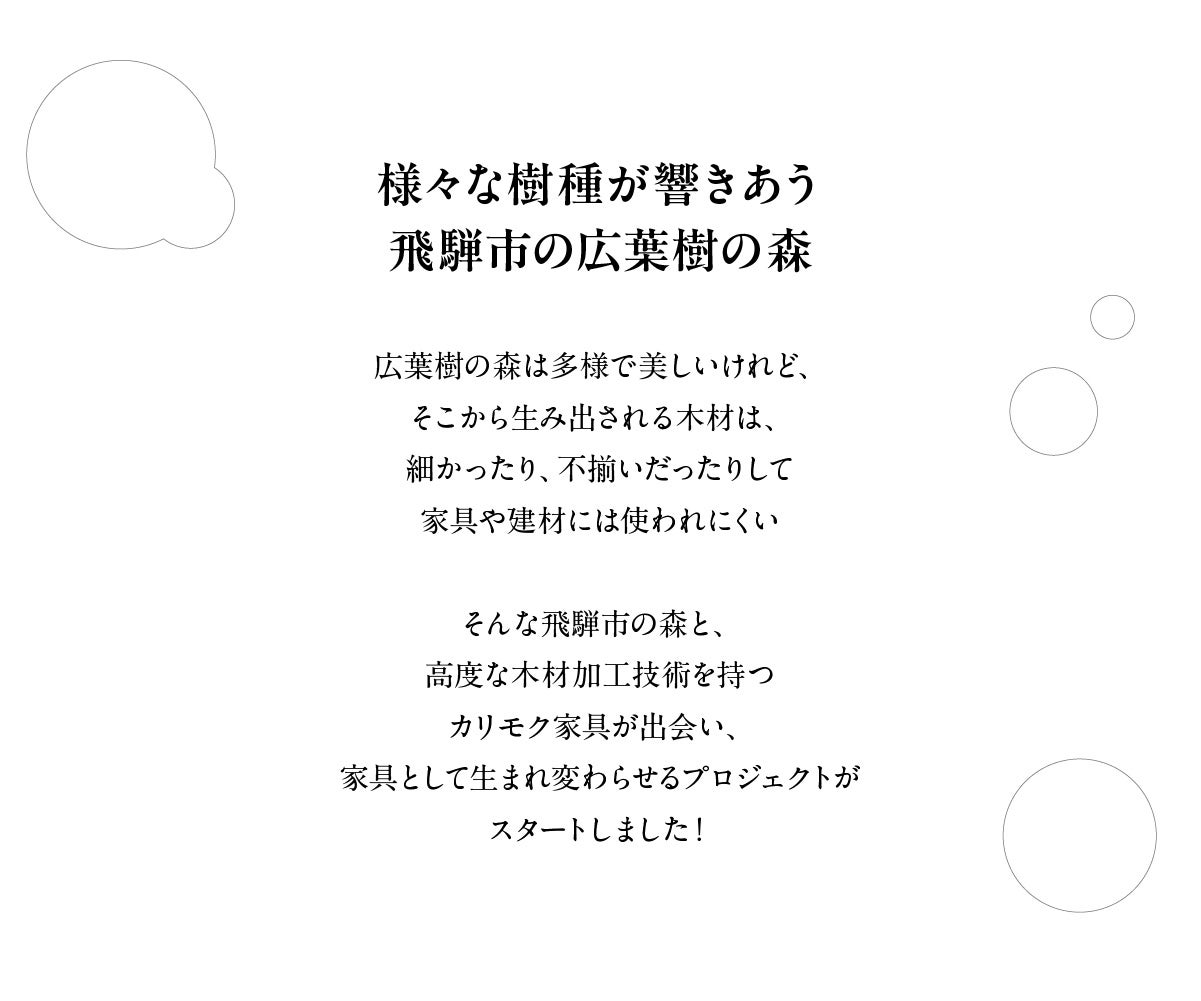 カリモク家具では「木とつくる幸せな暮らし」をミッションとして、お客様のよりよい暮らしに貢献すべく取り組んでおります。日本は世界でも有数の木材資源の豊かな国ですが、家具に使える広葉樹は適切な管理が進んでおらず、海外からの輸入に頼っています。そこで弊社では、環境に配慮した循環型のモノづくりを実現するため今まで家具づくりに活用されてこなかった曲がった木や節の多い木、小径木などを、自社の乾燥・接着・木工技術を駆使し、家具用材として活用することで、国内林業への貢献を図っていきたいと考えています。今回、飛騨市産地材を活用させて頂き、経験を積み重ねることで知見を増やし、地域と連携した家具づくりを目指してまいります。