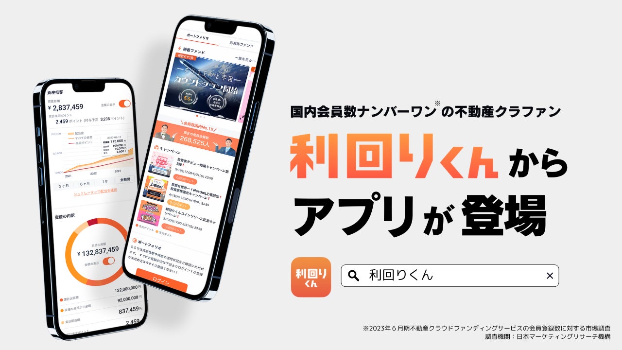 会員数国内ナンバーワン(※)の不動産クラウドファンディングプラットフォーム「利回りくん」が、新たなユーザーエクスペリエンスを提供するためのアプリをローンチしました。スマートフォンでの利用者はすでに7割を超えており、今後はアプリを活用することで、不動産投資に関わる手続きをスマートフォン上でよりスムーズに行うことができます。