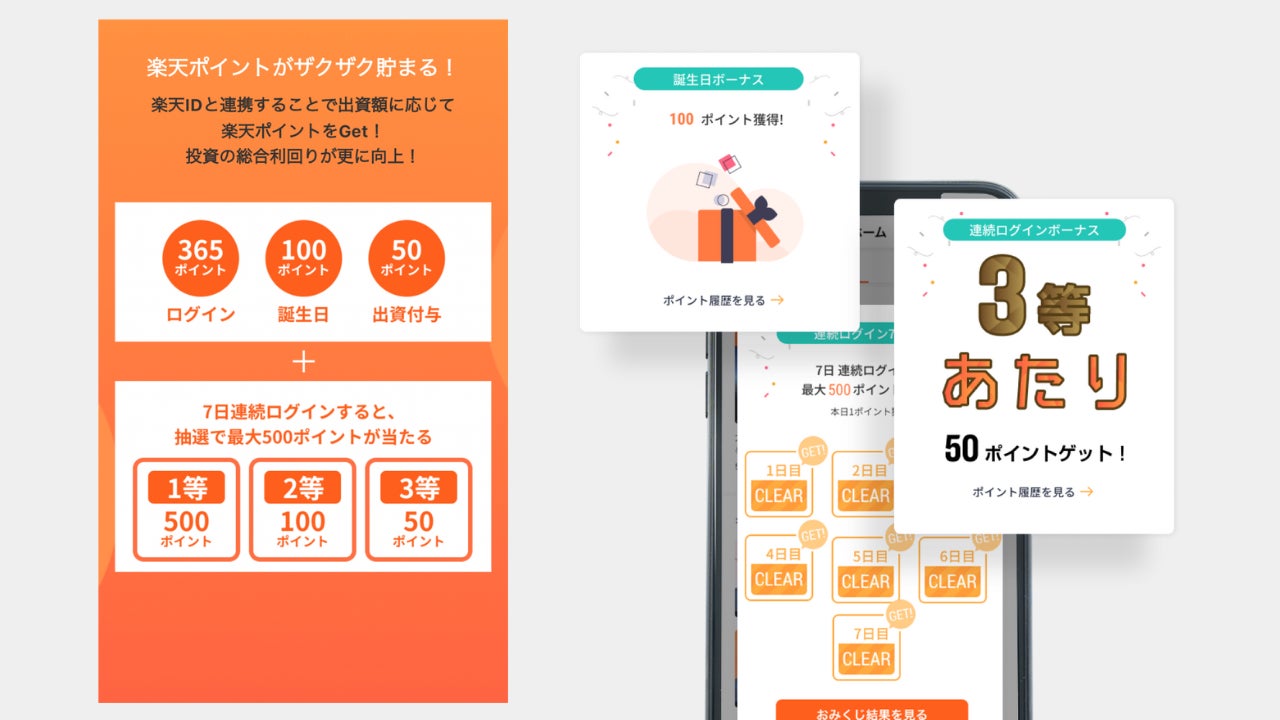 「利回りくん」は楽天ポイントと提携しています。新規の本人確認で50ポイント、初回の出資時には950ポイントの楽天ポイントが特典として付与されます。また、「利回りくん」にログインすることで毎日1ポイントから楽天ポイントが付与され、7日間連続でログインすると、最大500ポイント付与されるチャンスがあります。さらに誕生日には100ポイントがプレゼントされます。投資金額の0.5%相当の楽天ポイントも、利回りくんのファンドに投資した方に限り付与されます。