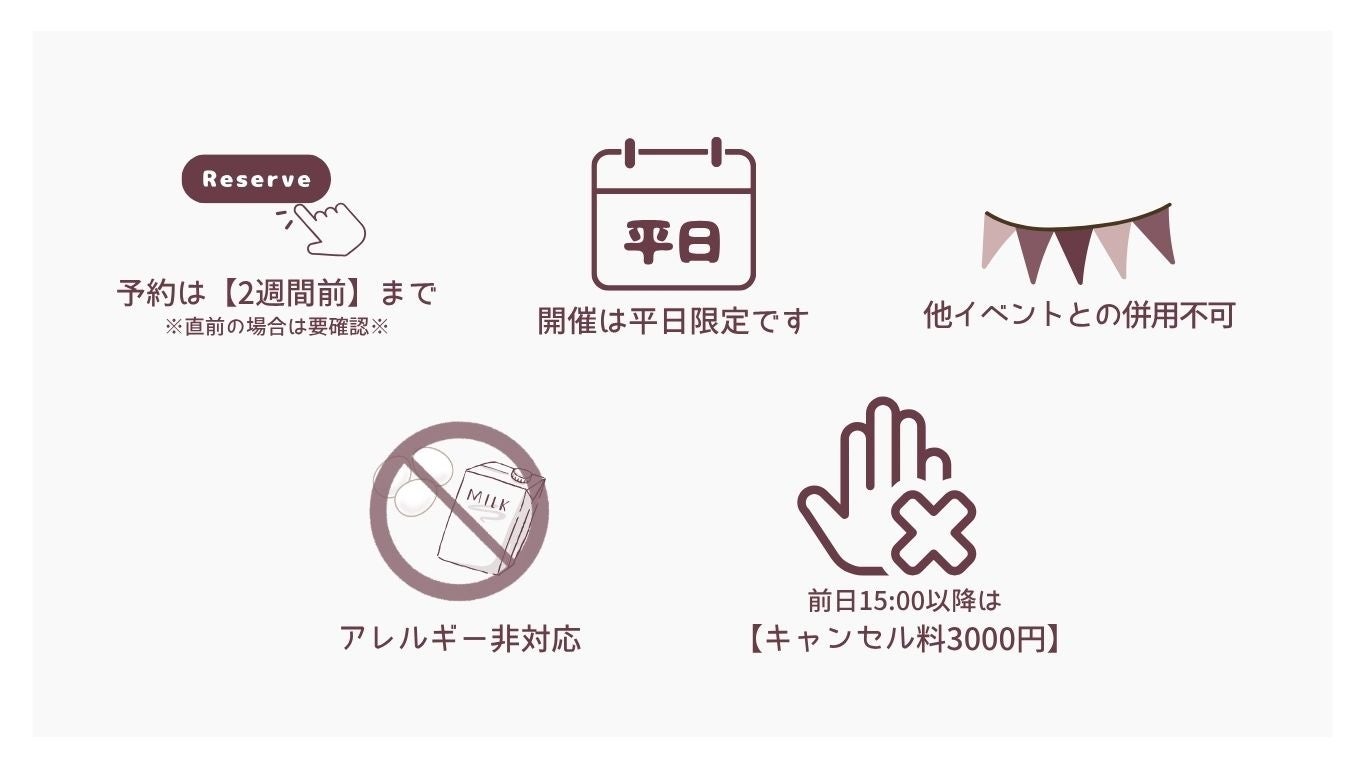 ケーキ付き撮影は平日のみ、兄弟一緒の撮影は不可です。