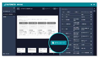 作成されたスライド資料は画面上でプレビュー表示とPowerPoint形式でのダウンロードが可能です。