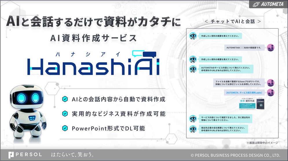 「はたらいて、笑おう。」をビジョンに掲げるパーソルグループのパーソルビジネスプロセスデザイン株式会社(東京都港区、代表取締役社長:市村 和幸、以下「パーソルビジネスプロセスデザイン」)が開発・提供するファイル自動整理サービス「AUTOMETA(オートメタ)」に、AIと会話するだけでスライド資料の内容を作成できる新機能「HanashiAI (ハナシアイ)」のβ版をリリースしたことをお知らせします。