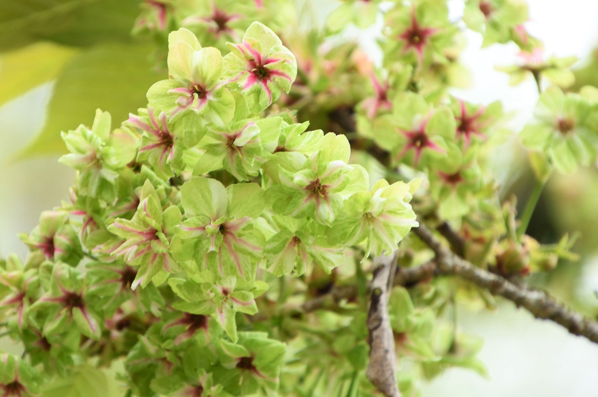 ピンクの桜とは一味違った薄黄緑色の花びらが重なりあい、美しい花を咲かせています。花は黄緑色から徐々に白っぽくなってからピンクの筋が入り、最後は花ごと落ちる形で散ります。