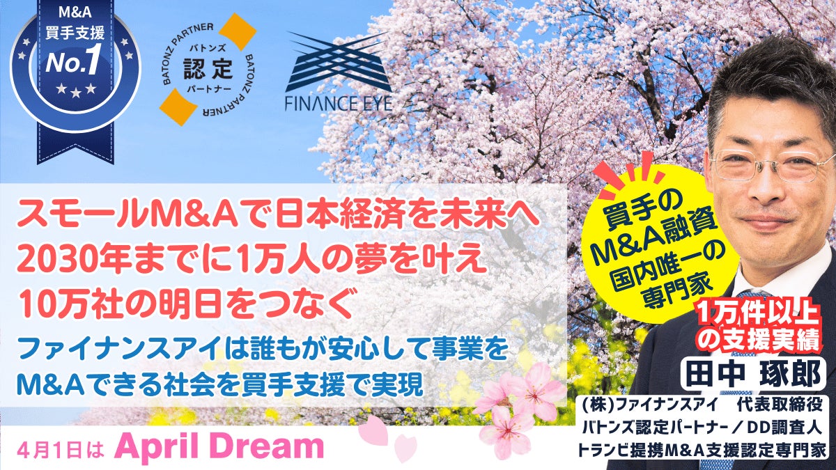 株式会社ファイナンスアイ(所在地:大阪市、代表:田中琢郎)は、4月1日に夢を発信する日にしようとする April Dreamプロジェクト に賛同しています。このプレスリリースは、株式会社ファイナンスアイの夢です。