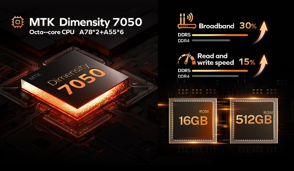 AnTuTuスコア 520,000 を誇るMTK Dimensity 7050は、優れたパフォーマンスを発揮します。最先端の 6nmプロセス を採用し、オクタコアCPUアーキテクチャを搭載。2つの高性能ARM Cortex-A78コア と 6つの省電力ARM Cortex-A55コア の組み合わせにより、処理能力と省電力性能のバランスを最適化しています。さらに、最大2.6GHzの周波数 により、スムーズかつ快適な操作体験を提供します。