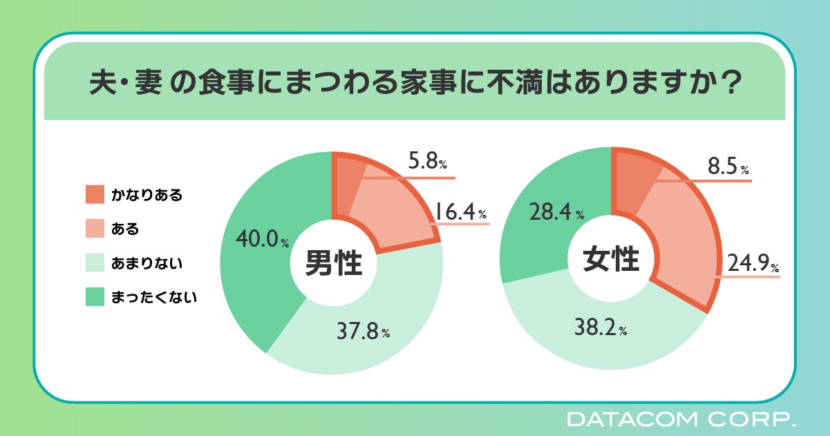 夫、妻の食事にまつわる家事に不満があるかという質問をしたところ、男性は「かなりある」5.8%、「ある」16.4%を合わせて22.2%。女性は「かなりある」が8.4%、「ある」が24.9%で合わせて33.3%と不満がある人も女性の方が約10%多いという結果になりました。