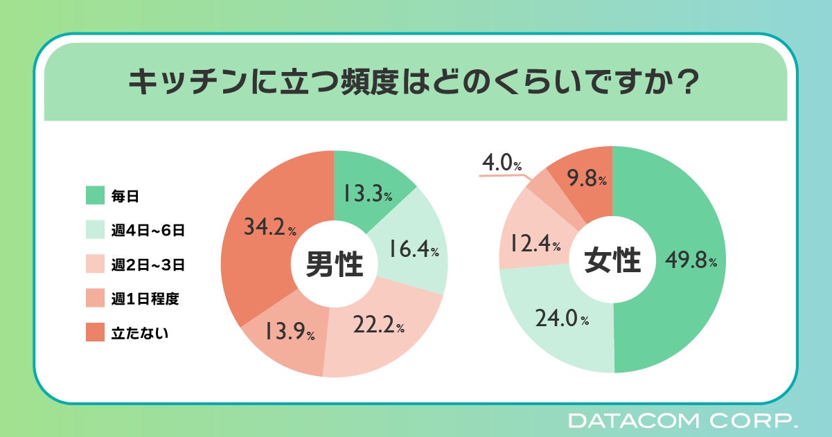 キッチンに立つ頻度を聞いたところ、男性は「立たない」の34.2%が最も多かったのに対して、女性は約半数の49.8%が「毎日」と回答しました。「毎日」と回答した女性のうち70.3%は有職であり、仕事をしながら毎日料理をしている女性が多いという結果になりました。
