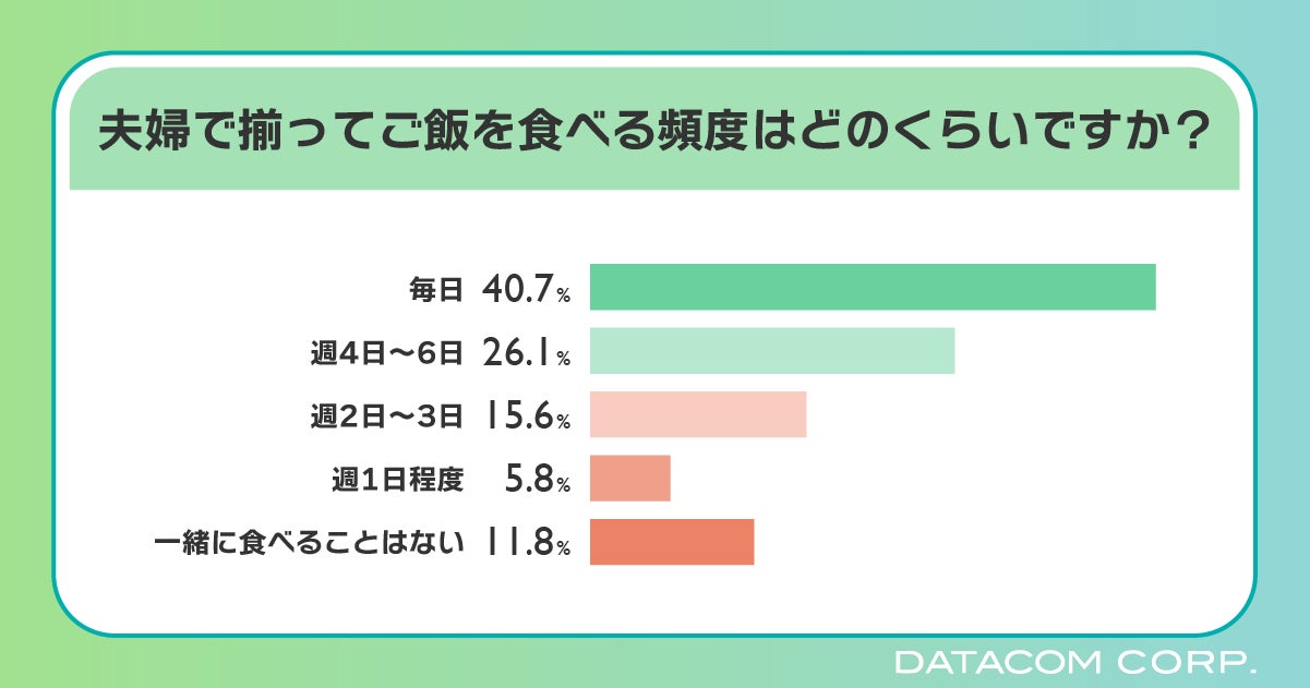 夫婦で揃って食事をとる頻度については、「毎日」が40.7%、「週4日~6日」が26.1%と半数以上が週の大半の日に夫婦で一緒にご飯を食べているという結果になりました。