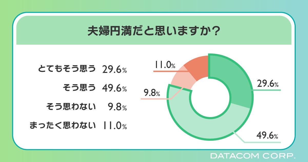 夫婦円満だと思うかという質問に対して、「とてもそう思う」と回答した人が29.6%、「そう思う」が49.6%で夫婦仲が円満だと感じている人が全体の79.2%と大多数を占めました。