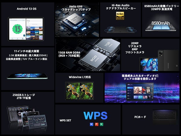 11 インチ+2.5K IPS in-cellディスプレイ、helio g99 2.2Ghz 8コア タブレット、15GB RAM +256GB ROM+2TB TF 拡張、4G LTE、20+8MP カメラ、8580mAh+33W PD急速充電