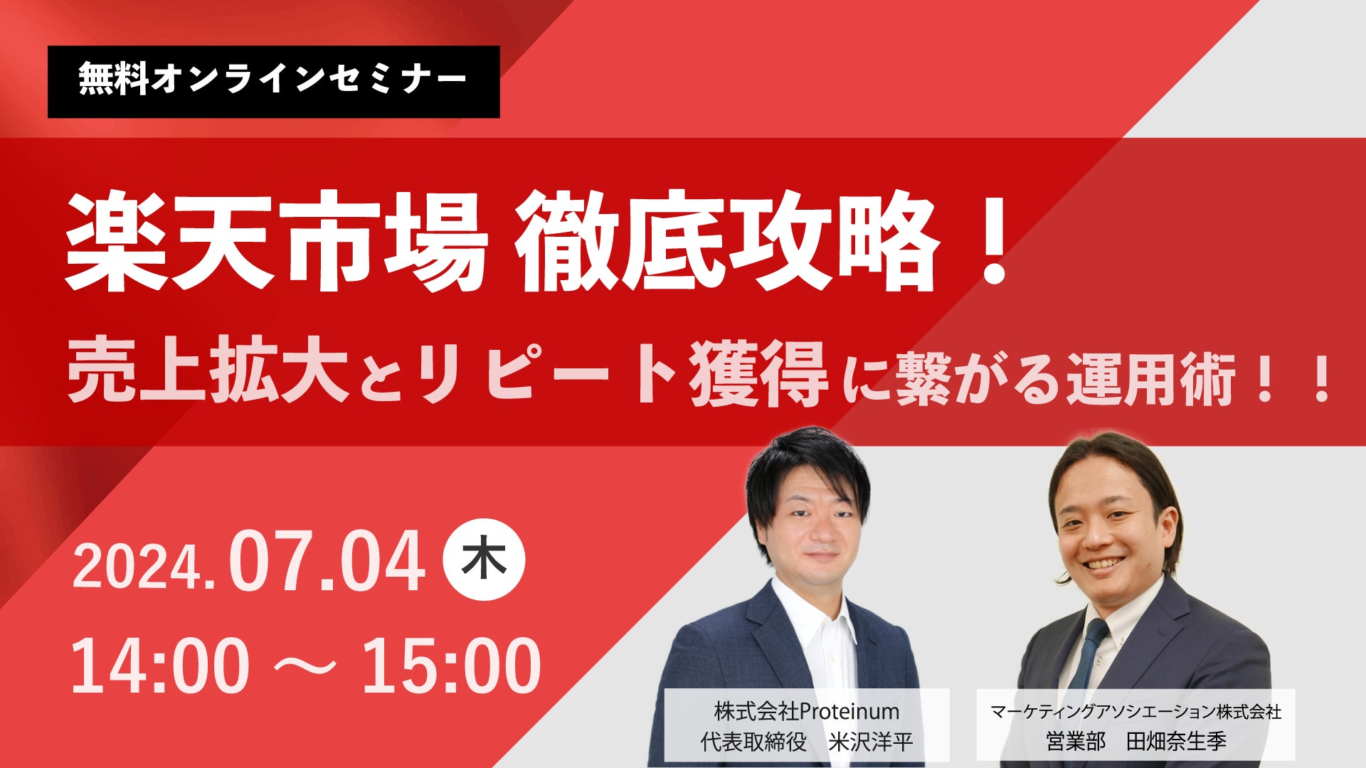 ECサイトの運営代行サービスを提供しているマーケティングアソシエーション株式会社(本社:東京都台東区 代表取締役:中園広和、以下当社)は、2024年7月4日(木)に、ウェブセミナー「楽天市場徹底攻略!~売上拡大とリピート獲得に繋がる運用術!!~」を、株式会社Proteinumと共催いたします。