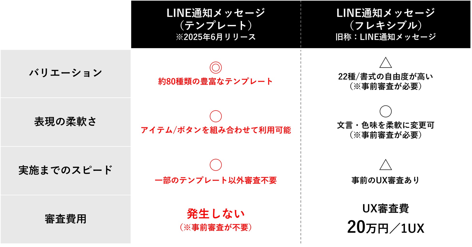 今回KNOTBOXが対応した「LINE通知メッセージ(テンプレート)」は、上図の通り審査費用が発生せず、迅速に導入できる点が大きな特長です。 さらに2025年6月のリニューアルで利用できるテンプレートが従来の22種類から約80種類へと拡充され、多様な顧客接点で活用できるようになりました。